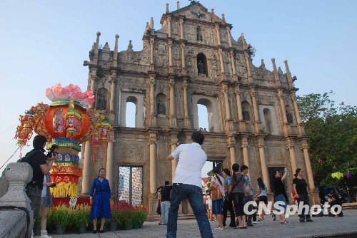 十月三日下午,澳门大三巴牌坊前游人如织。预计今明两天,访澳游客将达到高峰。中新社发 毕永光 摄