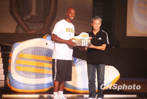 10月7日,首度登陆台湾进行季前热身赛的NBA球星在此间掀起超强篮球旋风。曾为NBA总冠军赛MVP的丹佛掘金队球星比卢普斯当日身披一号球衣,开心获赠专门依据其球风设计的全新篮球鞋,他表示,印象中的亚洲球员非常注重团队战术,这正是打篮球的正确态度,甚至是NBA球员也该学习的。中新社发 李佳佳 摄