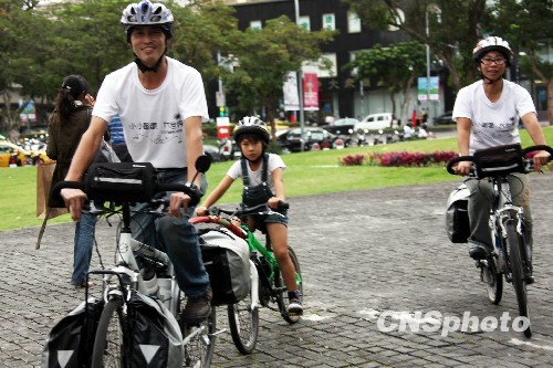 10月8日,台湾中华单车文化协会理事长陈守忠一家三人在台北展示今年暑假完成丝路单车壮游的装备。陈先生夫妇和女儿陈萱今年7月9日从西安出发,骑单车沿丝绸之路西行至9月10日到达吐鲁番,完成了全长二千余公里的“西游记”。六岁的陈萱也创下全球最小年龄骑单车游丝路的首例。陈守忠说,此次西游,遇到很多困难和挑战,也得到很多大陆民众的无私帮助,感念在心。中新社发 黄少华 摄