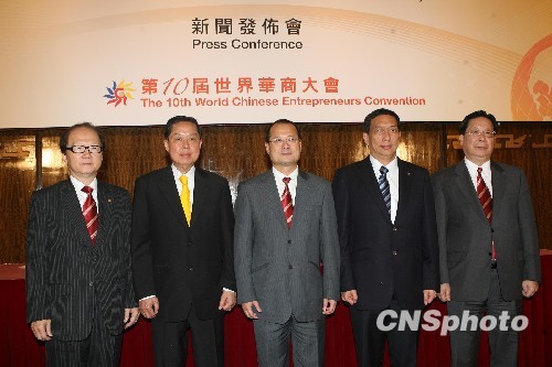 10月12日下午,“世界华商大会”现任秘书处香港中华总商会与第十届大会主办商会菲华商联总会,在香港联合召开新闻发布会,通报筹办最新情况。第十届世界华商大会将于今年11月19日至22日于菲律宾首都马尼拉举行。图为香港中华总商会会长蔡冠深慱士(中)、菲华商联总会理事长黄祯潭慱士(左二)、大会组委会主席蔡聪妙大使(右二)等,在发布会上与记者见面。中新社发 郑祚声 摄