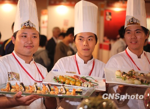 10月12日,第二届台北厨王争霸赛暨2009台北国际厨王邀请赛落幕,台北同心同德队技高一筹,勇夺“厨王”称号。本次比赛从9日开始,先从台湾厨艺高手进行争霸赛,参赛者以鲭鱼、鸵鸟肉与顶级腓力牛肉三种指定食材做出料理,决出优胜者,再和来自广州、北京、上海、香港和新加坡、马来西亚等地的高手,切磋中华美食技艺,争夺台北国际厨王邀请赛的“厨王”桂冠。中新社发 李佳佳 摄