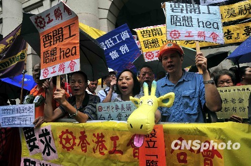 十月十四日,香港多个团体趁行政长官曾荫权向立法会提交二零零九至二零一零年施政报告之际,在立法会大楼前请愿,希望即将推出的施政报告更加关注民生。中新社发 谭达明 摄