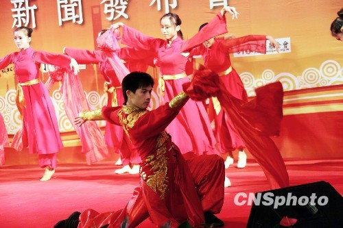 10月15日,台北上海文化周正式启幕,掀起两岸文化交流新高潮。图为上海著名舞蹈家黄豆豆(前)等在开幕记者会上表演舞蹈《龙腾虎跃》。即日起,上海昆剧团的经典折子戏及全本大戏、上海世博会图片展等文化活动将陆续登陆台北,通过表演艺术、视觉艺术、电影电视等不同角度,加深台北市民对上海的认识。此番“上海文化周”出动了上海文化界精英170多人,是两岸开放文化交流以来,上海在台湾举办的规模最大的一次综合性文化交流系列活动。四大门类的15场表演艺术演出,为期4周的各项展览等活动,号称海派文化特色鲜明的秋季艺文盛宴。中新社发 黄少华 摄