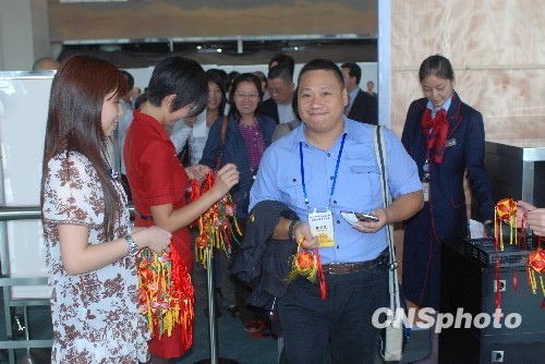 十月十九日,澳门-南宁航线开通,参加中国-东盟博览会的澳门企业家代表团成为首批乘客之一。该航线由澳门航空公司经营,这是澳航继桂林航点后开通的第二条澳门至广西航线。中新社发 毕永光 摄