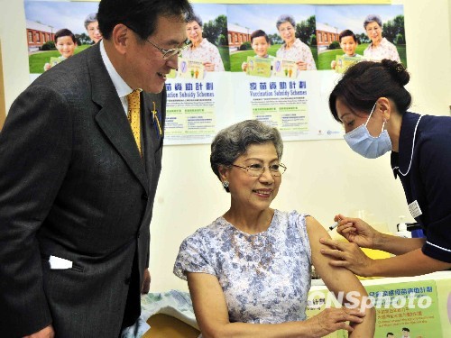 十九日,香港卫生福利及食物局局长周一岳(左)到一间社区健康中心,了解当天推出的“长者疫苗资助计划”实施情况。香港特区政府十月十九日起至明年三月底,推出疫苗资助计划,六十五岁以上长者及六岁以下儿童,可到私家诊所以优惠价接种季节性流感疫苗。中新社发 谭达明 摄