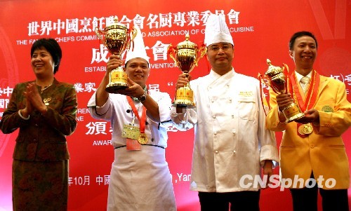 10月20日,首届国际中餐青年厨师争霸赛扬州揭晓,来自韩国、新加坡、荷兰、日本、美国等10个国家及地区的40名厨师,经过激烈的角逐。来自世烹联国际评委分别从“味道”、“质感”、“观感”和“卫生”四个方面,评出最佳创意奖、最佳造型奖各1人和国际中餐厨王金奖9人、银奖12人和铜奖12人。澳门厨师张志欢(右三)、福建厨师胡满荣(右一) 澳门厨师吕家祥(右二) 位列前三名,分别荣获冠军、季军、亚军。中新社发 崔佳明 摄