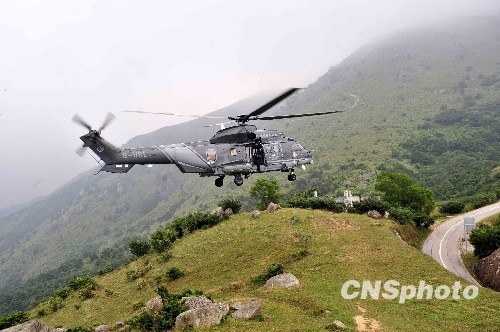 十月二十日,香港特区政府消防处、渔农自然护理署及政府飞行服务队,在大帽山郊野公园向传媒展示在重阳节期间各部门如何通力合作防止山火。图为飞行服务队派出一架超级美洲豹直升机即场示范。中新社发 谭达明 摄