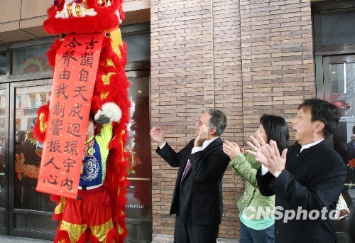10月21日,为期三周的“古今回响”中国文化音乐节在美国卡内基音乐厅揭幕,艺术节将为期21天。图为从左到右为:卡内基音乐中心行政和艺术总监克莱夫、琵琶演奏家吴蛮、中国泉州市木偶剧团团长王景贤在卡内基音乐中心的揭幕仪式上。中新社发 魏晞 摄