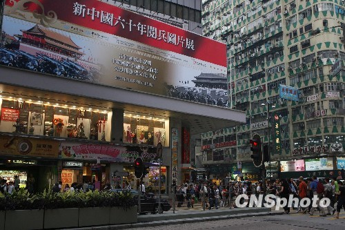 10月22日,一则硕大的广告醒目地张挂在位于香港闹市区的裕华国货大厦上。由中国新闻社主办的“新中国六十年阅兵图片展”,将于本月二十七日至十一月一日在沙田新城市广场、中环国际金融中心商场、尖沙咀香港文化中心举行。这项活动得到国务院港澳办、中央人民政府驻港联络办、外交部驻港特派员公署、驻港部队和特区政府等的大力支持,新鸿基地产提供赞助。中新社发 郑祚声 摄