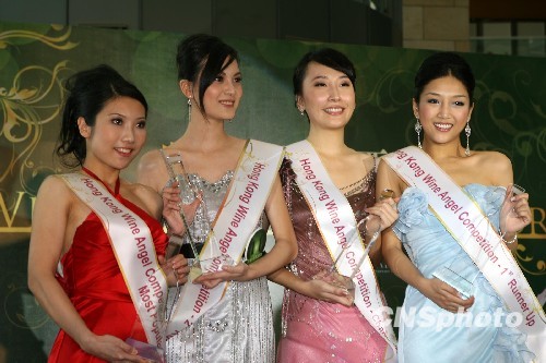 十月二十六日,由数码港商场与香港红酒协会等举办、十二位经预赛产生的佳丽,在数码港商场进行“香港第一届美酒天使大赛”总决赛,经过激烈角逐名花有主。韩国姑娘崔惠媛(右二)荣获冠军、陈祖宜小姐(右一)获得亚军、金子珺小姐(左二)获得季军、罗昊昕小姐(左一)获得网络推荐奖。中新社发 郑祚声 摄