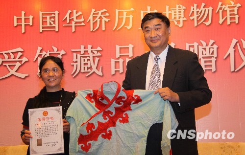 十月三十日,美国侨胞招思虹女士(左)在北京华侨大厦向中国华侨历史博物馆捐赠1939年美国旧金山华裔售卖的中国传统服装,中国侨联副主席李祖沛(右)接受捐赠物品。目前,中国华侨历史博物馆已接受捐赠藏品两万余件。 中新社发 史利 摄
