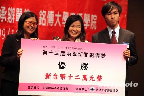 11月4日,由台湾中华发展基金会主办的第十三届两岸新闻报道奖在台北举行颁奖典礼,台湾“陆委会”主委赖幸媛为获得电视新闻报道奖的客家电视台记者林秋伶、徐荣俊颁奖。今年评选活动共有十类、二十八件新闻作品入围,分别从传播、新闻、政法、经济及两岸关系等多方面、多角度地进行了深入报道,呈现出全面展开且更为深入的良性趋势。承办方、铭传大学传播学院院长陈耀竹表示,希望藉由该活动让两岸互相了解传播现状,减少认知上的差异。中新社发 李佳佳 摄