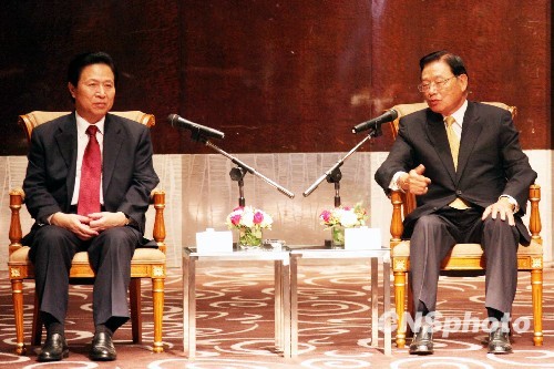 11月10日,台湾海基会董事长江丙坤(右)在台北与来访的中共江苏省委书记梁保华会面。江丙坤表示,明年的两岸两会会谈准备从经济领域转到文化、教育、新闻交流,这些会比经济更能缩短两岸人民的距离,进一步推动两岸关系,“台湾江苏周”是两岸人员交流和专业论坛很好的开始。中新社发 黄少华 摄
