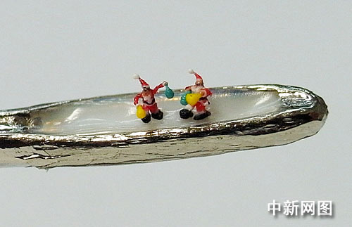 13日,台湾著名微雕家陈逢显发表的新作——“世界最小圣诞老人”。缝衣针孔中的迷你圣诞老人,高只有零点八毫米,宽零点五毫米,系由微粒树脂凝胶雕刻而成,再着色,需用高倍放大镜才能一睹端倪。陈立宇 摄