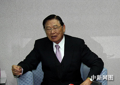 台湾海基会12月14日举行第七届董监事会第五次联席会议。图为海基会董事长江丙坤(左一)会后向媒体记者介绍第四次“陈江会谈”筹备情况。陈立宇 摄