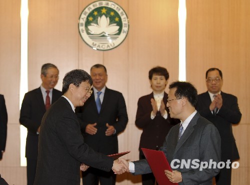 12月14日,中国人民银行副行长朱民(左前)和澳门金融管理局主席丁连星在澳门签署了补充监管合作备忘录。澳门行政长官何厚铧出席了备忘录签字仪式。中新社发 廖攀 摄