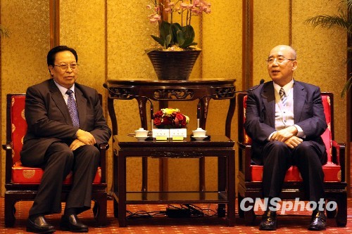 中国国民党荣誉主席吴伯雄十二月十四日在台北圆山饭店,会见中共中央委员、原河南省委书记徐光春所率河南省访问团。中新社发 曾嘉 摄