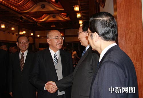 由中共中央委员、原河南省委书记徐光春率领的河南省参访团14日抵台。图为中国国民党荣誉主席吴伯雄在台北圆山大饭店欢迎徐光春(右二)一行。作者:陈立宇