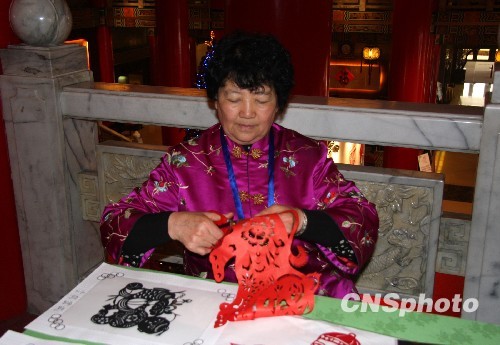 12月15日,河南省民俗艺术展暨河南农民画展在台北圆山大饭店开展。图为河南省非物质文化遗产传承人朱秀云在展示会上演示剪纸艺术。中新社发 陈立宇 摄