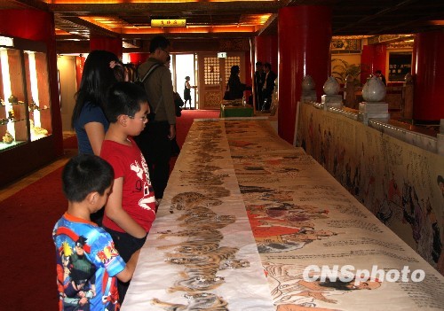 12月15日,河南省民俗艺术展暨河南农民画展在台北圆山大饭店开展。图为台湾民众观赏河南“画虎第一村”画家作品。中新社发 陈立宇 摄