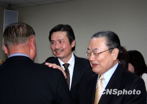 12月16日,中国国民党举行中常会,金溥聪正式从党的副主席詹春柏手中接下他兼任的秘书长职务。图为会前金溥聪(中),在詹春柏(右)的带领下和与会中常委见面致意。中新社发 陈立宇 摄