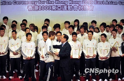 十二月十八日,香港特首曾荫权为东亚运动会香港运动员颁发表扬奖,嘉奖运动员在东亚会中取得的骄人成绩。当日,香港政府联同中国香港体育协会暨奥林匹克委员会,在香港中央图书馆举行祝捷会。中新社发 谭达明 摄
