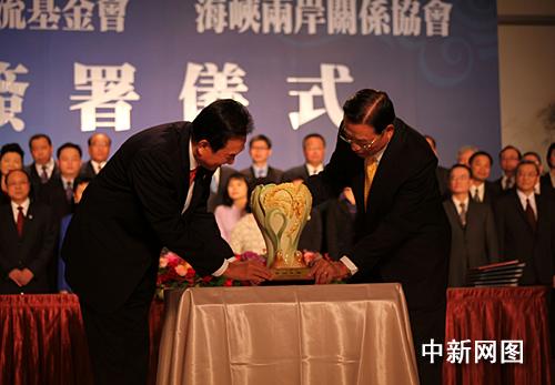 12月22日,第四次两岸两会会谈达成协议签署仪式在台中市裕元酒店举行。图为协议签署后海基会董事长江丙坤向海协会会长陈云林致赠礼物“安和升祥”。 中新社记者 陈立宇 摄