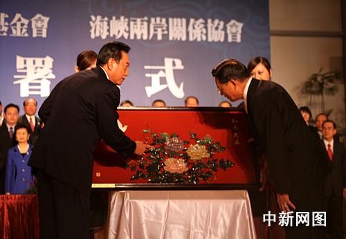 12月22日,第四次两岸两会会谈达成协议签署仪式在台中市裕元酒店举行。图为协议签署后海协会会长陈云林向海基会董事长江丙坤致赠礼物“和平发展”。中新社记者 陈立宇 摄