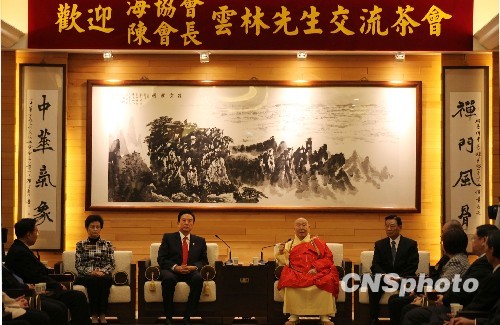12月24日,台湾中台禅寺主持惟觉法师在禅寺中道堂举办茶会,欢迎大陆海协会会长陈云林一行。中新社发 陈立宇 摄
