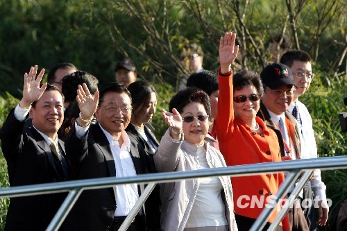 海基会董事长江丙坤夫妇二十四日陪同海协会会长陈云林夫人赖晓华(穿红衣者),乘船游览日月潭。据了解,陈云林由于当日下午在日月潭涵碧楼与亲民党主席宋楚瑜会面,未能乘船游湖。中新社发 曾嘉 摄