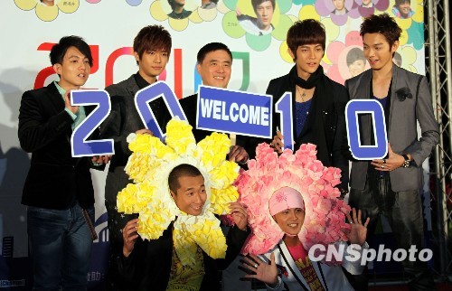 由台北市政府与TVBS共同主办的跨年晚会,即将在十二月三十一日在台北市政府前市民广场热闹展开,晚会除了五月天、林志玲独家在台北市演出之外,还有担任上海世博会台北馆亲善大使的王力宏压轴演唱,跨年倒数的台北一0一烟火秀等精彩节目。图为宣传记者会上,台北市长郝龙斌(后排中)与飞轮海等艺人共同推介晚会。中新社发 曾嘉 摄