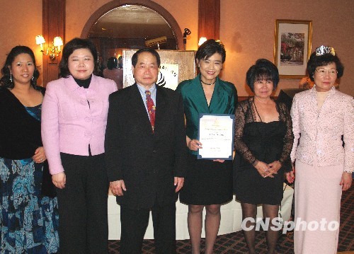 12月31日,美国联邦众议员赵美心和加州众议员伍国庆一起来到洛杉矶中国城狮子会参加当地华人跨年联欢,赵美心还向全美华人致赠新年贺状,迎接2010年。中新社发 卢威 摄