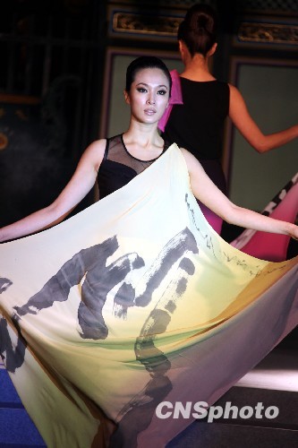 由台北市政府主办的第六届汉字文化节——汉字“尚”潮服装秀暨汉字潮T设计大赛,二日晚间在台北孔庙内举行。设计师透过服装作品呈现动态的文字之美,为汉字文化作新的诠释,让观众从另外一个角度欣赏书法艺术之美。中新社发 曾嘉 摄