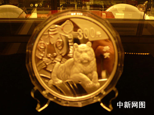1月7日,农历虎年将至,由大陆中国金币总公司发行的虎年贺岁金银纪念币也已由“中国金币”品牌在台湾的总代理大洋金银币有限公司在台湾销售。图为大陆虎年贺岁纪念币。