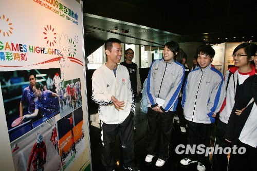 1月9日,“第五届东亚运动会图片回顾展”在香港柴湾青年广场举行。图为李静等香港获奖运动员,在展出现场与慕名前来观展的青少年一起重温难忘一刻。中新社发 郑祚声 摄