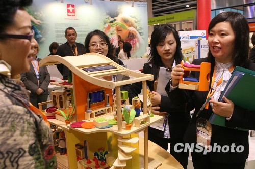1月11日上午,吸引二千多家企业参展、规模居世界前矛的“香港玩具展”如今已踏入第三十六届,今届展览增设了“检测及认证服务”强化展览的“安全”意识。这是总部在瑞士的参展企业在向客商介绍产品的环保与安全指标。中新社发 郑祚声 摄