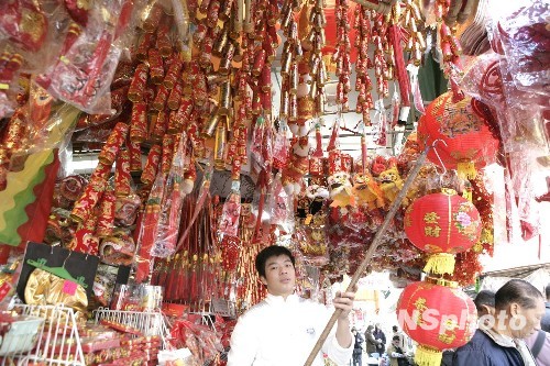 一月十三日,香港街头商贩正在悬挂大红灯笼,随着中国传统春节的来临,香港过节气氛越来越浓。中新社发 张勤 摄