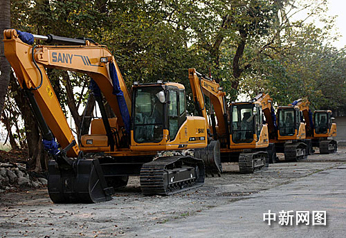 去年台湾“八八水灾”发生后,大陆捐赠台湾千套组合屋,其中部分就搭建在台湾红十字会位于屏东县潮州镇光春里的忠诚营区。图为1月14日营区中停放的湖南红十字会捐赠的救灾设备三一重工生产的推土机。陈立宇 摄