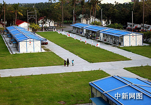 去年台湾“八八水灾”发生后,大陆捐赠台湾千套组合屋,其中部分就搭建在台湾红十字会位于屏东县潮州镇光春里的忠诚营区。图为1月14日营区中的大陆捐赠组合屋俯瞰。蓝色房屋为大陆捐赠组合屋。陈立宇 摄