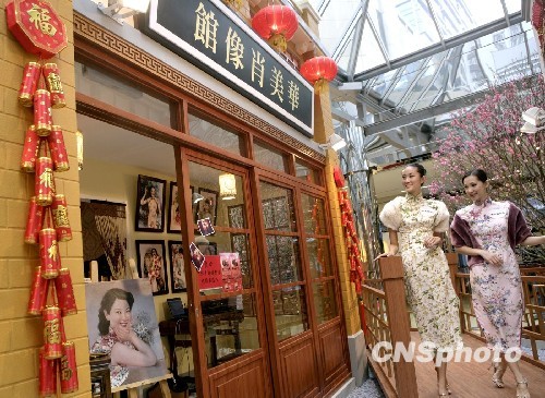 1月25日,香港一家商场精心布置迎新年,以“歌舞昇平夜上海”为主题,让游客及市民在店堂里领略穿梭昔日上海繁华街道,体验绚丽繁华贺新年气氛。中新社发 张勤 摄