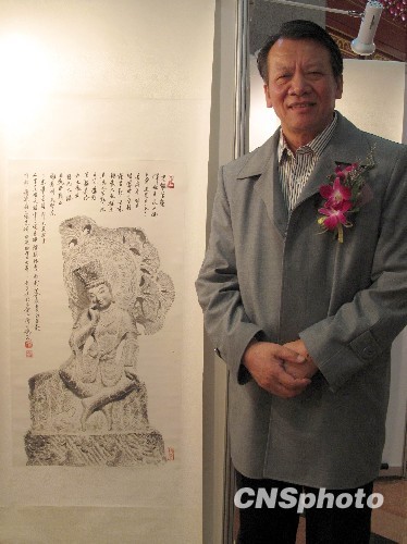 影星汤唯之父、自号“北雁山人”的知名居士画家汤余铭,26日起在香港举办题为“佛缘”的画展。汤余铭说,女儿最喜欢的佛像是思维菩萨。他说,思维菩萨体现的是佛的智慧。图为汤余铭与思维菩萨的画像。中新社发 余瑞冬 摄