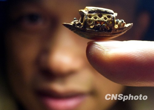 1月29日晚,由台湾公共电视台和法国法德艺术电视台合拍的“皇帝的玩具箱”艺术纪录片在台湾首映,片中展示了台北故宫博物院珍藏的乾隆皇帝的“多宝格”艺术品,“多宝格”中有一件珍玩是清代名匠陈祖章以一个橄榄核雕刻的载人小船,船上共有八人。图为台湾著名微雕家陈逢显以一个橄榄核依其立意而作,船上共有十人,以发扬光大中华文化。中新社发 陈立宇 摄