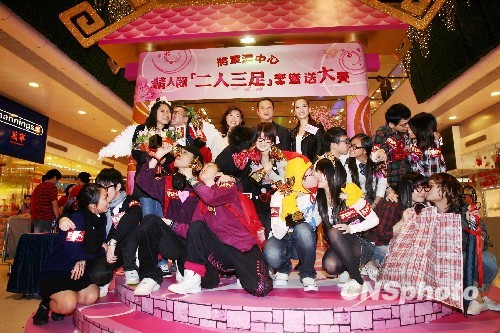 1月31日下午,虽然离情人节尚有时日,但香港青年人的温情活动已十分热络。这是在将军澳中心参加“二人三足蜜蜜送”大赛的获奖选手,赛后表达欢乐的情景。中新社发 郑祚声 摄