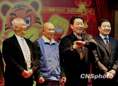 2月5日,中国侨界元老的原侨联主席庄炎林(左一)、原国侨办主任郭东坡(右二)和原副主任彭光涵(左二),与国务院侨办副主任任启亮一起,出席北京侨校三校校友会新春联欢时,登台向海内外华人华侨祝贺新春。中新社发 贾国荣 摄