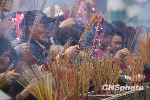 2月14日大年初一,香港市民蜂拥前往著名庙宇黄大仙祠,敬献新年头柱香。中新社发 郑祚声 摄