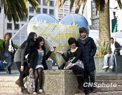 2月14日情人节前夕,4位来自香港的少男少女在旧金山市中心联合广场的心型雕塑前合影,雕塑上印有旧金山城市地图。中新社发 陈钢 摄