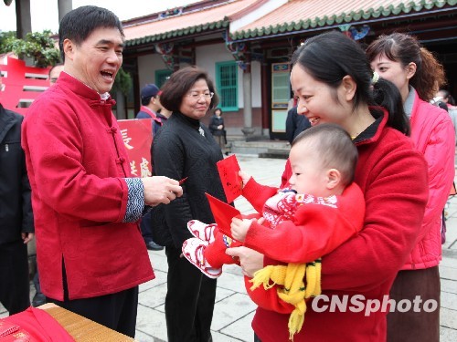2月15日(农历正月初二),台北市长郝龙斌(左)来到台北孔庙,给前来向孔子进香的市民们发红包。中新社发 耿军 摄