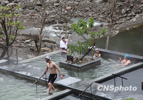 春节长假,台湾北部连续多日降温降雨,北部居民为躲避湿冷气候,纷纷前往温泉泡汤。图为台北市民在苗栗“泰安观止”温泉会馆户外泡汤池,边泡汤边赏山林风景。中新社发 耿军 摄