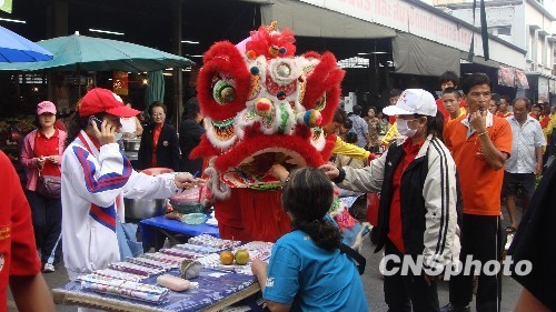泰国彭世洛醒民学校2月19日举办“雄狮贺春 送幅进门”活动。当天早上,4支狮队一同从醒民学校出发,按照4条不同的路线,走进彭世洛府的大街小巷。狮队所到之处,马路上立刻呈现沸腾的景象:掌声、笑声、喝彩声交织在一起。只见狮子双眼炯炯有神,身披七彩云霞,花样层出,雄风尽展:或狮子洗面、或狮舞绣球等等,将狮子的形象演绎的惟妙惟肖,淋漓尽致,生动有力。街上的人们既兴奋又好奇,连行车的人们甚至停下脚步看热闹,亲眼目睹这难得的原汁原味舞狮。中新社发 顾时宏 摄