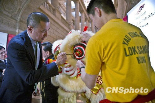 当地时间2月22日,香港驻旧金山经贸处在亚洲艺术博物馆举办虎年新春招待会,约350位嘉宾参加。图为香港驻旧金山经贸处梁永恩处长(右二)于招待会前为醒狮点睛。中新社发 陈钢 摄
